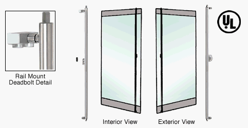 For 1/2" or 3/4" Tempered Glass Doors Stock Sizes Available for Immediate Shipment Custom Sizes Ship Within Two to Four Weeks Available with a Wide Selection of Exterior Fixed Pull Handles on Special Order Certification: ANSI/BHMA A156.16 Grade 1 This CRL Glass Door Deadbolt Handle is designed to allow maximum view and a contemporary look to 1/2 or 3/4 inch (12 or 19 millimeter) tempered glass doors. Installations can be made on single or double doors. For your convenience, we have designed the handles so they are ready to install on 36 to 48 inch (914 to 1219 millimeter) wide doors ranging in height from 90 to 102 inches (2286 to 2591 millimeters) high without modifications. Keyed Lock standard on interior and exterior side of handle. Optional thumbturn to replace keyed lock. Custom Headers available with your choice of pre-installed hardware. Dustproof Strike available for doors secured at bottom. SPECIFICATIONS Material: 1-1/4 Inch (32 millimeter) Diameter Brass or Stainless Steel Tubing (1.5 millimeters thick) Glass Thickness: 1/2 or 3/4 Inch (12 or 19 millimeter) Glass Fabrication: Varies Please contact us at ORDERING OPTIONS When ordering Deadbolt Handles you must specify: DB100, DB110 or other Interior Handle Series shown on page DC27 in the DC04 catalog Exterior Handle Option ( page DC29 click here ) Right or Left Hand (as viewed from the outside) Rail Mount (for doors with full length rails) or Glass Mount (for doors with patch rails) Single or Double Door Strike (for single acting doors) Brushed or Polished Stainless, Satin or Polished Brass Finish Contact us for specification details and pricing on these handles for "All Glass" Entrance Doors. Please call (888) 663-9830, or by e-mail .